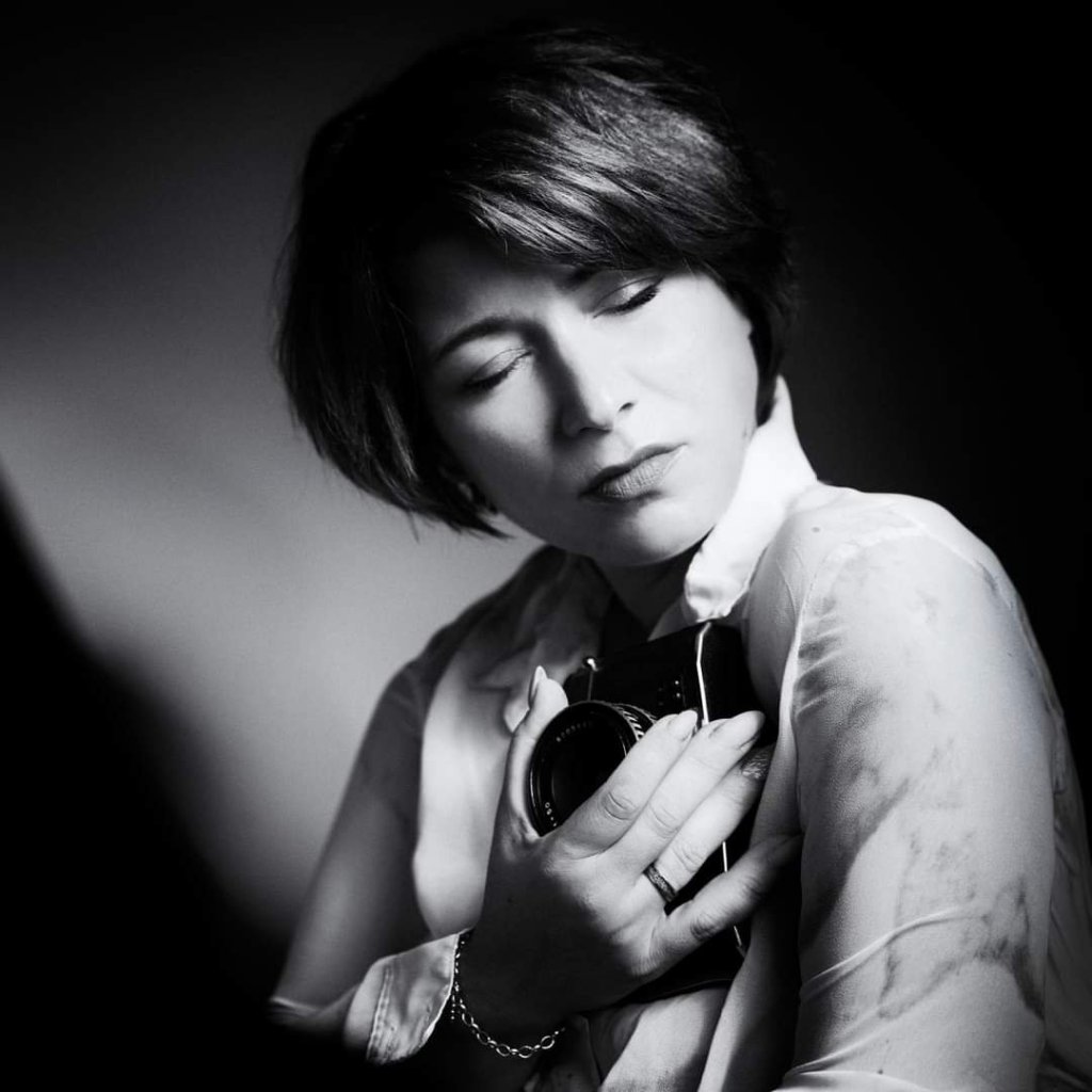 Na lewej piersi aparat w dłoni,